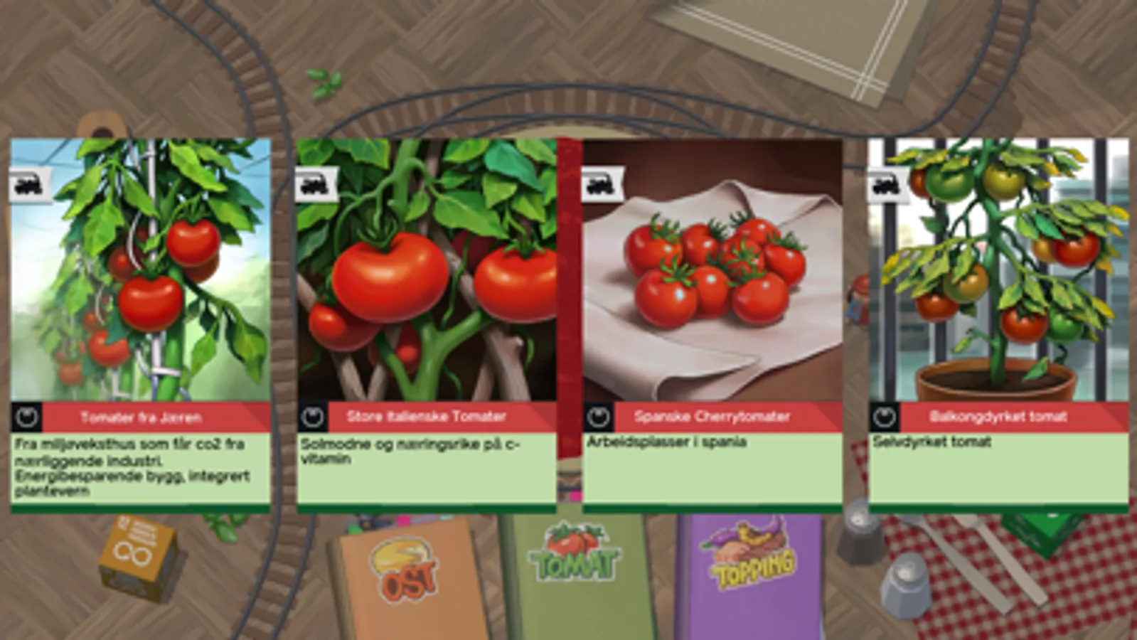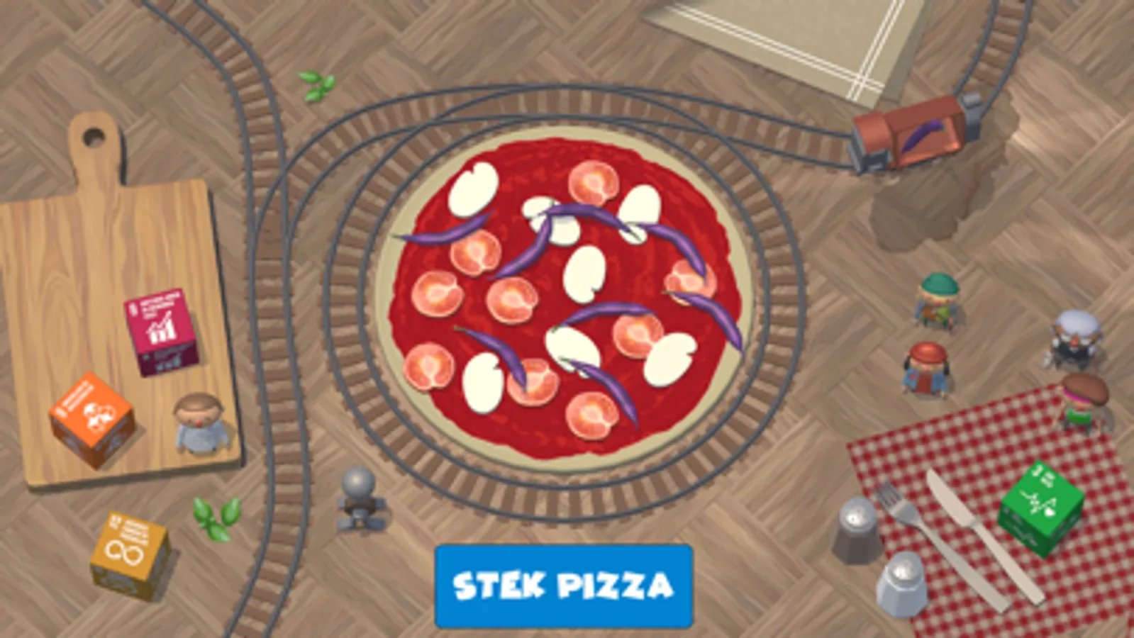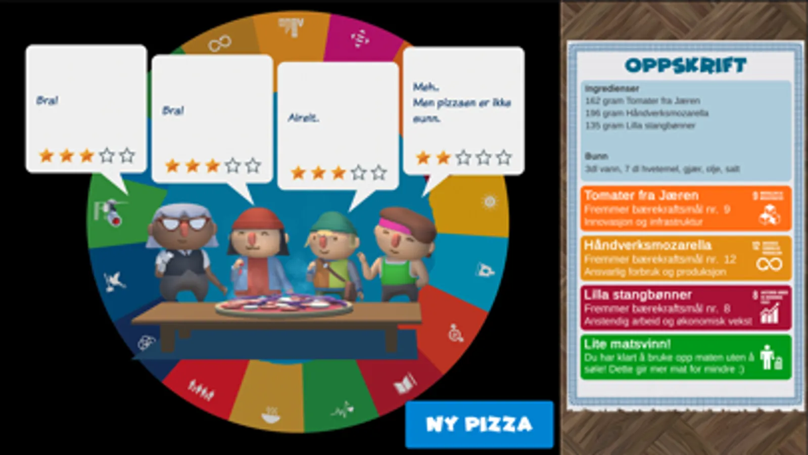 Hva er viktigst for deg? Alle som spiller Pizzatoget møter noen kresne karakterer underveis som kommenterer valgene du tar. Tar du hensyn til arbeidernes rettigheter? Tenker du på hva som er sunt for kroppen? Er du mest opptatt av innovasjon i matproduksjonen? Vil du motarbeide klimaendringer? Eller er det kanskje ansvarlig forbruk som er viktigst for deg? Uansett så skal pizza nytes.