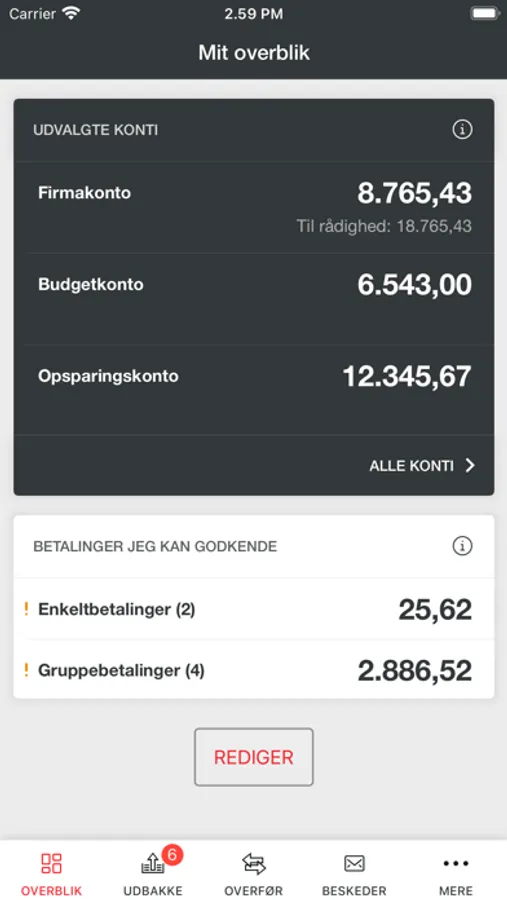 Totalbanken Mobilbank Erhverv giver dig overblik over virksomhedens konti, samt mulighed for at oprette og godkende betalinger på farten.