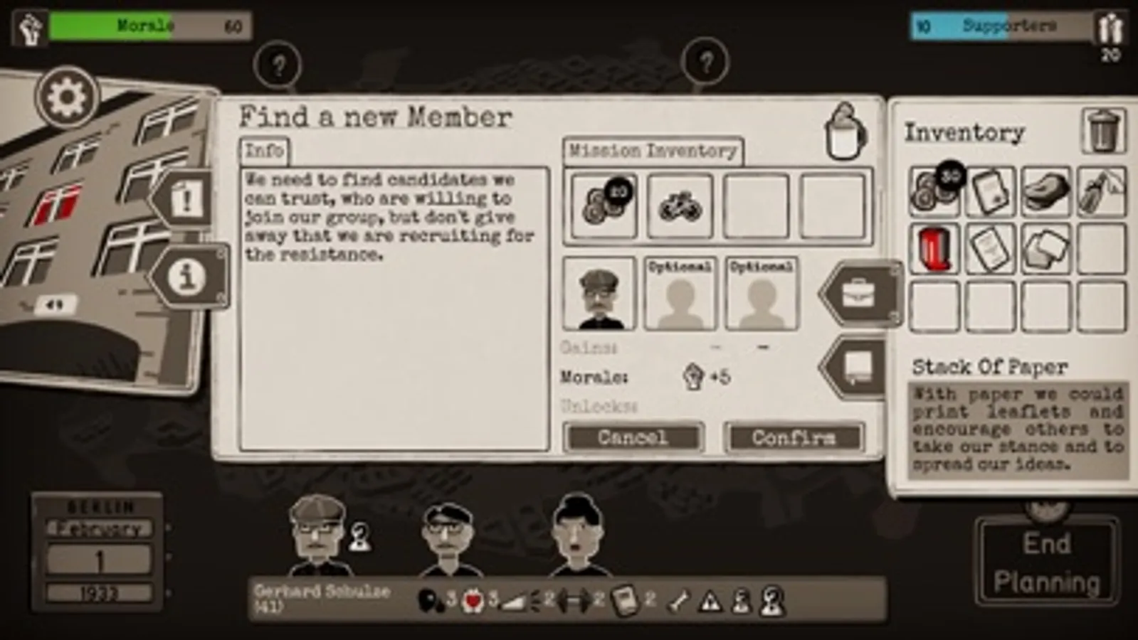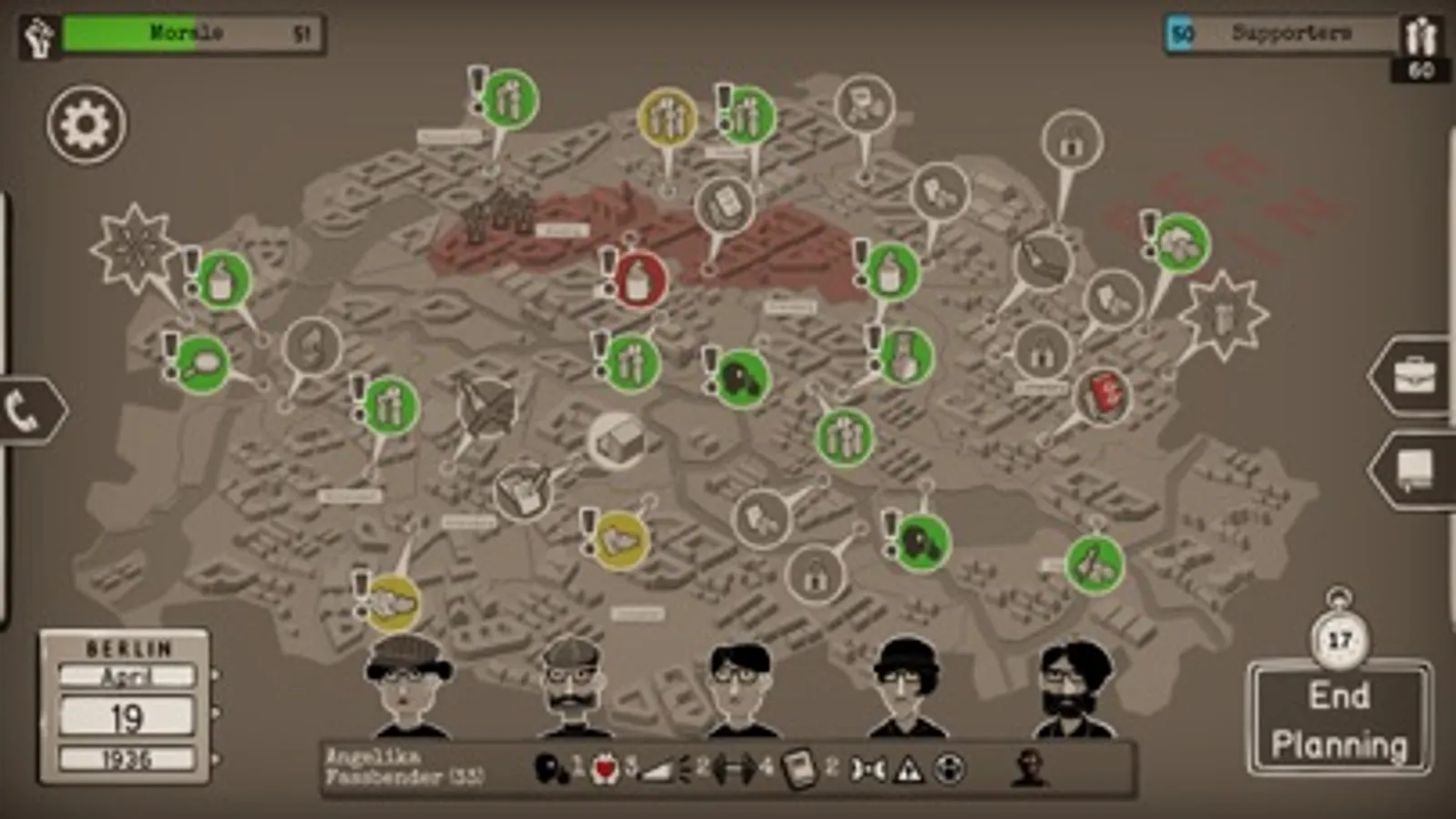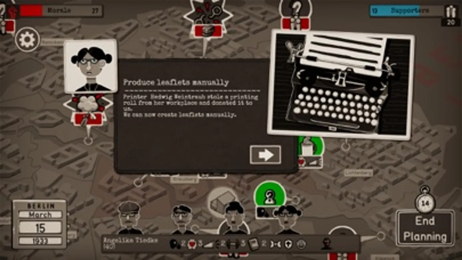 You are the leader of a small resistance group in 1933’s Berlin, of ordinary people, from Jews to Catholics and Communists to Patriots who simply can’t stand aside. Your goal is to deal with small blows to the regime – dropping leaflets to spread awareness about what the Nazis are really up to among the people, painting messages on walls, sabotaging, gathering information and recruiting more followers. And all of that while staying undercover – if the regime’s forces learn about your group, the life of each member is in grave danger.