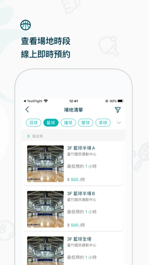 ● 場地預約:確認運動場地類別後,開始預約,可以選擇時段、日期,顯示可預約場地清單,點選預約該場地