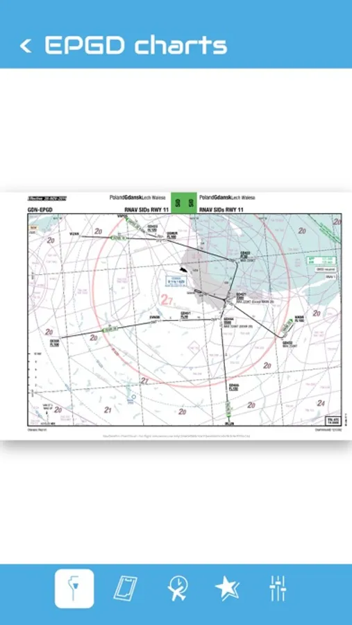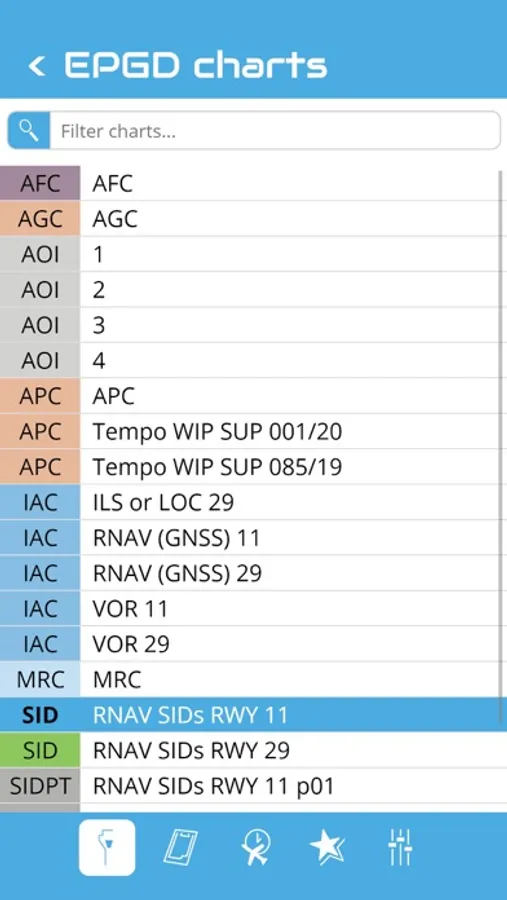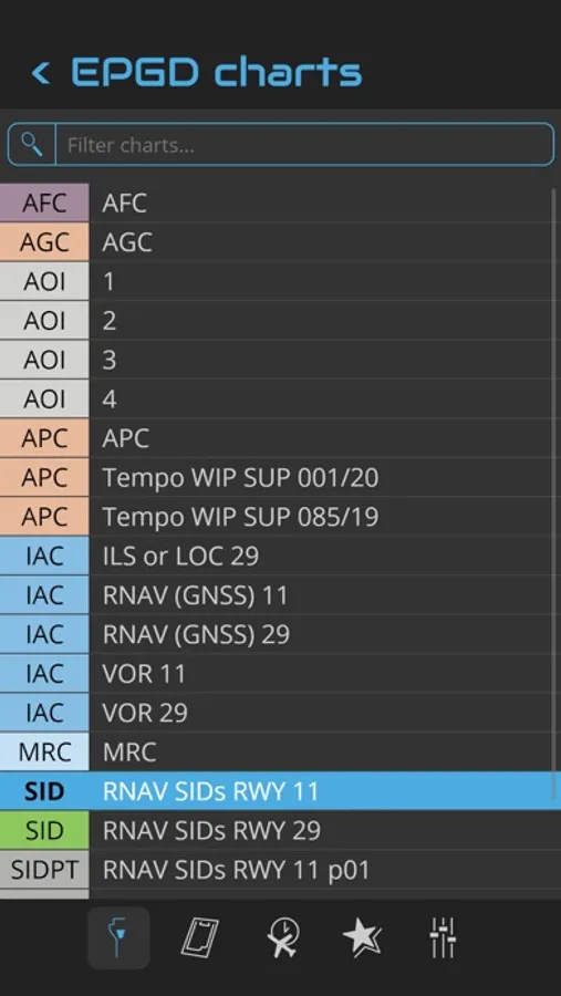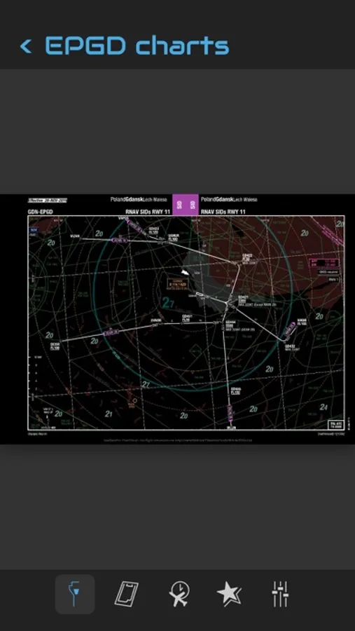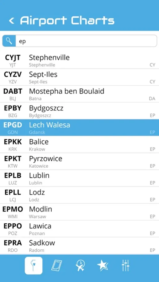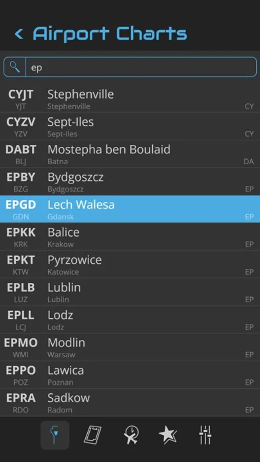 You can search an airport in the airport list. Simply enter your departure, destination and alternate airport in the Quick Flight menu for a quick access to the airport charts. Use the kneeboard feature during your flight to have all needed charts handy.