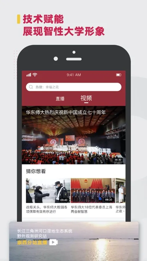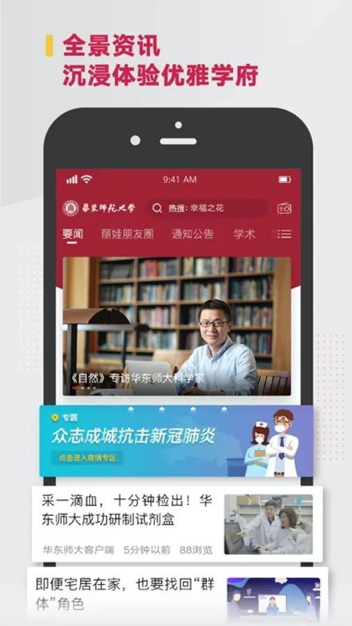 华东师范大学APP是“迎双庆·促发展·惠民生”三年行动计划中学校影响力提升工程重点支持的融媒体产品。通过发布华东师大资讯、玩转丽娃朋友圈,沉浸式讲述华东师大故事;特别推出战疫专栏,助力在线学习;开通实验站直播页面,展现无边界校园;嵌入校园邮箱、班车查询、在线翻译、掌上博物馆等功能,创造更好的“指尖”体验。此为第一期建设。