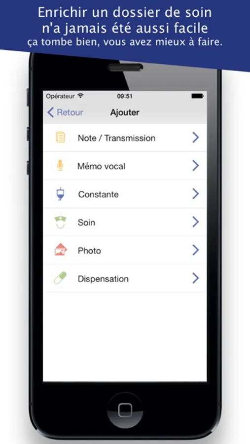 Vous êtes infirmier ? Créez des dossiers de soins directement depuis votre iPhone, au chevet des patients. L'appli permet d'enregistrer en un clin d'oeil les soins, traitements, constantes biologiques, diagrammes de soins et photos de plaies pour enrichir les dossiers de soins de vos patients. Les données peuvent ensuite être exportées au format PDF.