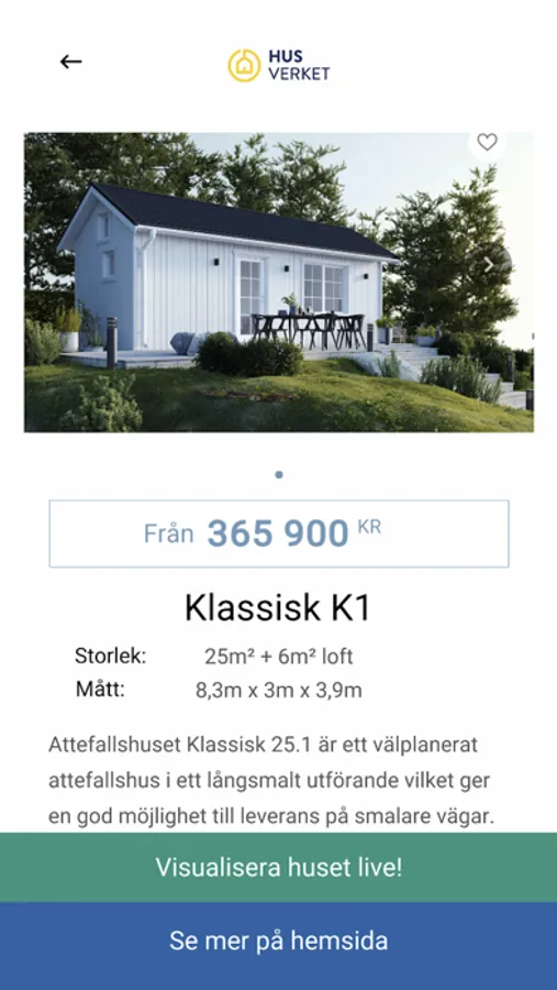 Upplev fullskaliga husmodeller från Husverket AB i verkligheten, innan de byggts med hjälp av Husverket AR. Bläddra bland virtuella husmodeller och placera ut dem i dess verkliga miljö och kontext. Du kan skala, rotera och flytta byggnader fritt längs marken för att placera de precis som du själv vill ha det. Gå omkring och granska byggnaden som om den faktiskt vore där på plats, på riktigt. Bege dig in i den, upplev dess interiör och beskåda utsikten ifrån dess fönster.