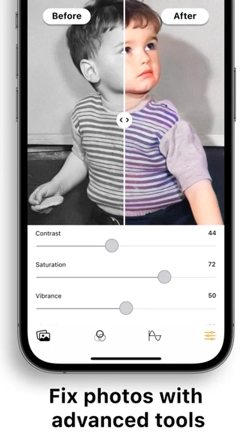 Sharp and vibrant photos always look better compared to old photos. Pholorize makes it possible to edit and sharpen photos for also enhanced and colorized photos. You can easily adjust sharpen and vibrant settings.