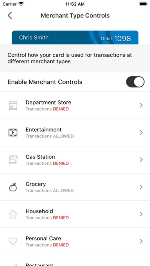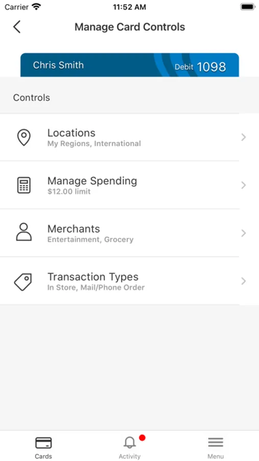 Set spending limits to decline transactions above your thresholds. Monitor activity by category such as gas stations and restaurants, and by type: in-store purchases, e-commerce transactions and ATM transactions.