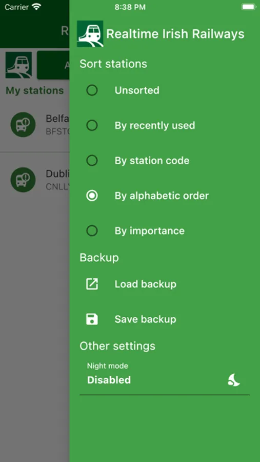 → Backup. You can load and save backup all your stations will be stored in a file in the memory of your device.