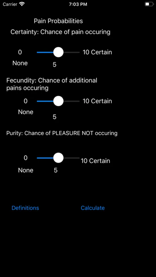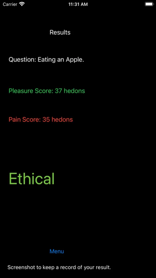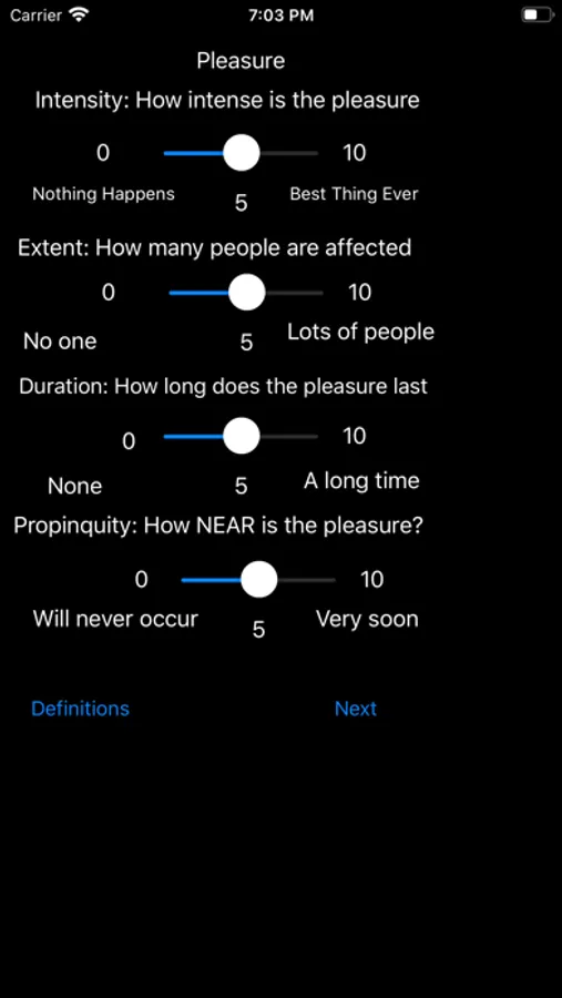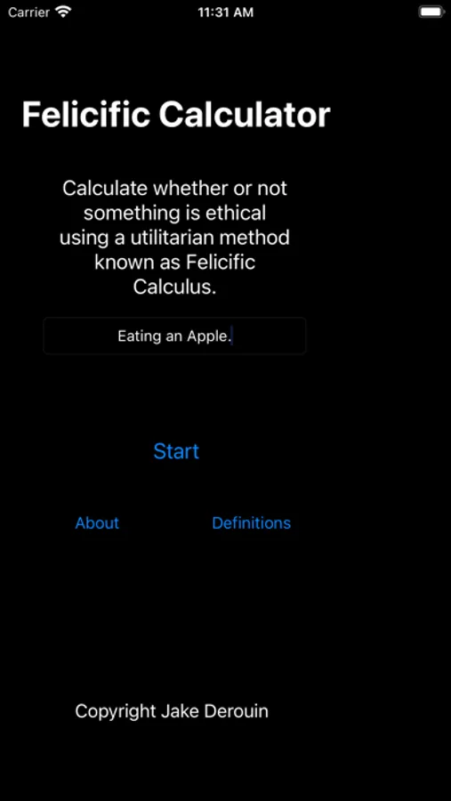 Calculate whether an action is morally ethical or unethical using Felicific Calculus! Felicific Calculus was developed by the utilitarian philosopher Jeremy Bentham as a potential method of determining whether or not an action is ethical by quantifying the pain and pleasure experienced by people affected by the action. The Ethics Calculator allows you to easily use the Felicific Calculus method to determine what course of action you should take when given an ethical dilemma with this unique utilitarian philosophy. You can also easily save your results for later viewing in the app. It is the best Utilitarian Utility!