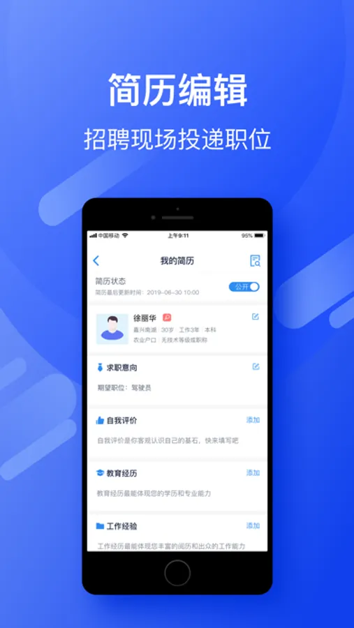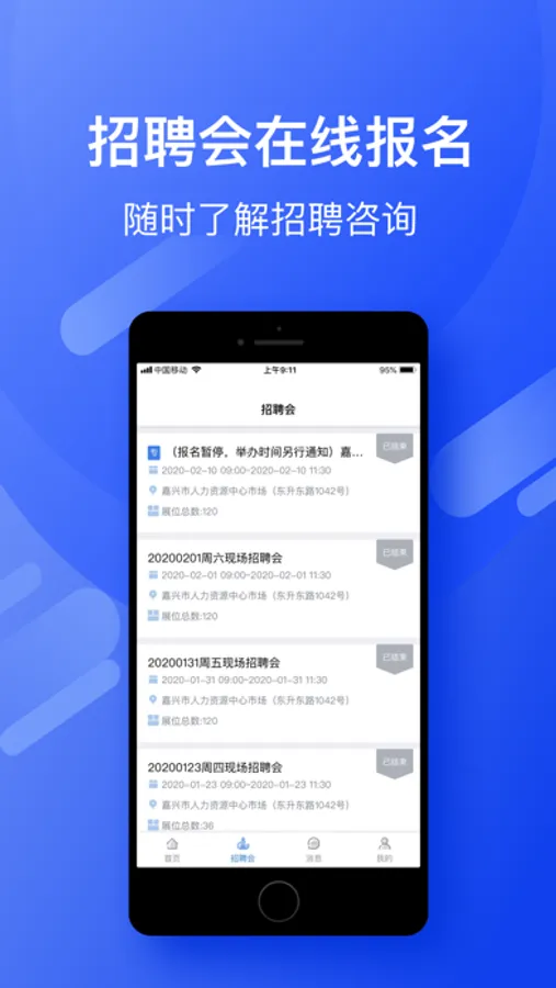 求职者通过嘉兴就业APP上可查看现场招聘会,编辑简历信息,浏览招聘岗位,收藏招聘职位,查看简历投递,接收面试邀请等功能。