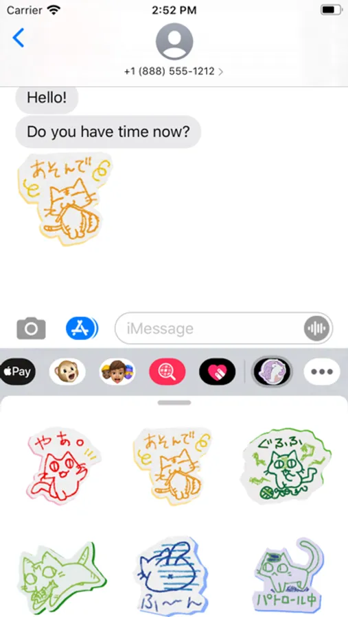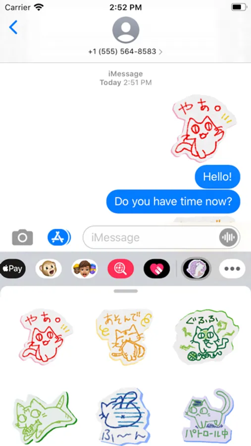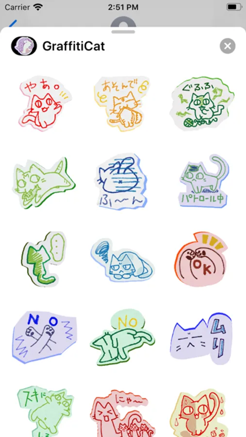 カラフルな画用紙に色鉛筆で描いたようなネコのスタンプ40種類を使い放題!