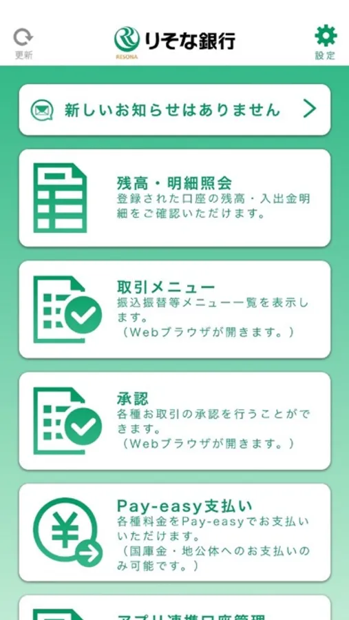 本アプリにご登録いただいた普通預金・当座預金口座の残高や入出金明細が簡単にご確認いただけます。また、お振込みやPay-easyでのお支払を行うこともできます。
