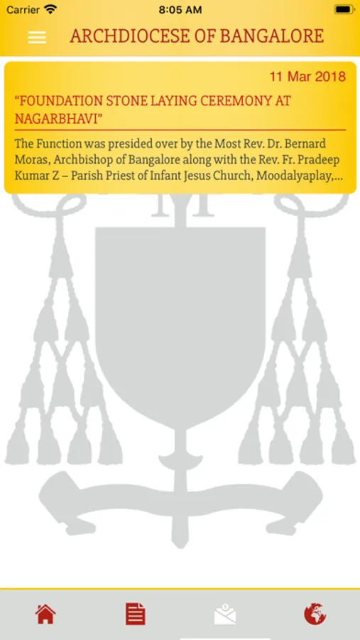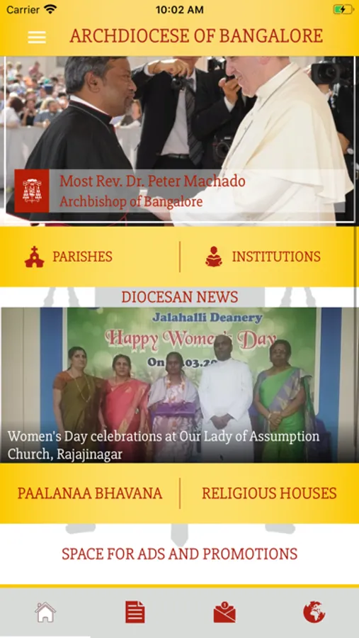 The Mobile App, “Archdiocese of Bangalore”, is designed and hosted by the Archdiocesan Communication Center, is an apt tool to stay connected with the Bangalore Archdiocese and receive up to date information of its parishes and institutions. Users may also use the app to share the various news and events of the Archdiocese – including videos and other media contents.