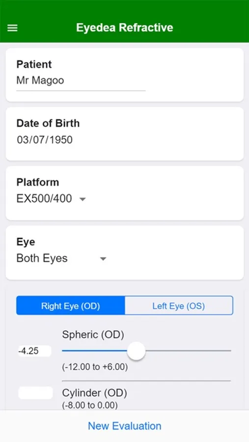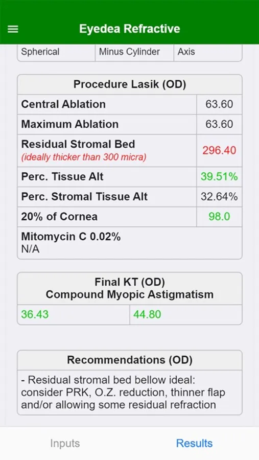 After providing basic information of the refractive surgery candidate, such as intended flap and optical zone, it informs refraction after nomogram application, central ablation, maximal ablation, residual stromal bed, PTA, PSTA, mitomicyn time, fina KT, LERS, among others.