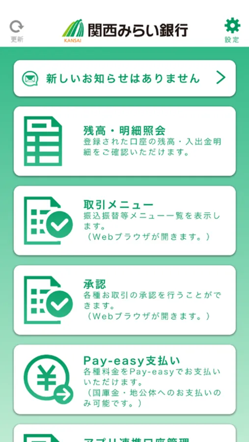 関西みらい銀行が提供する法人版インターネットバンキング「関西みらいビジネスダイレクト」の公式アプリです。