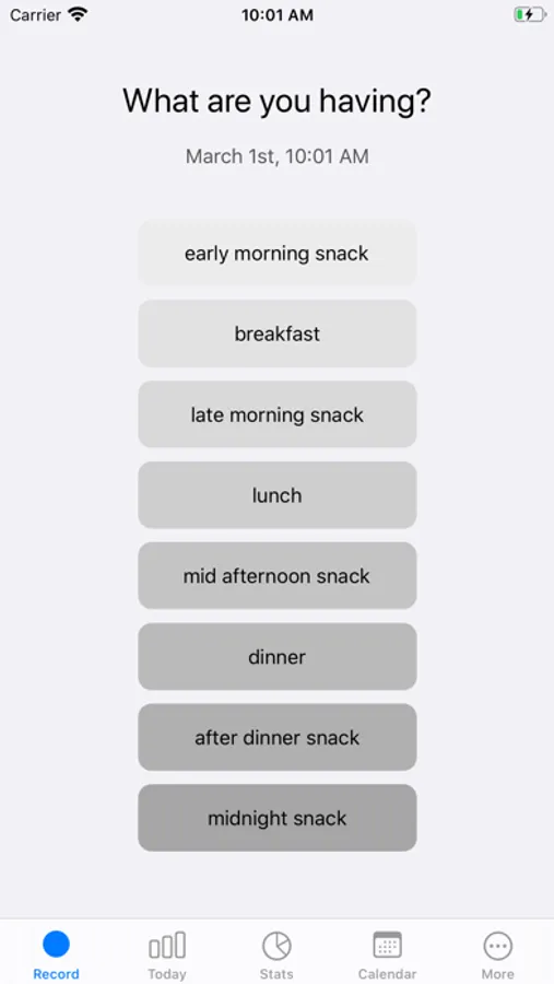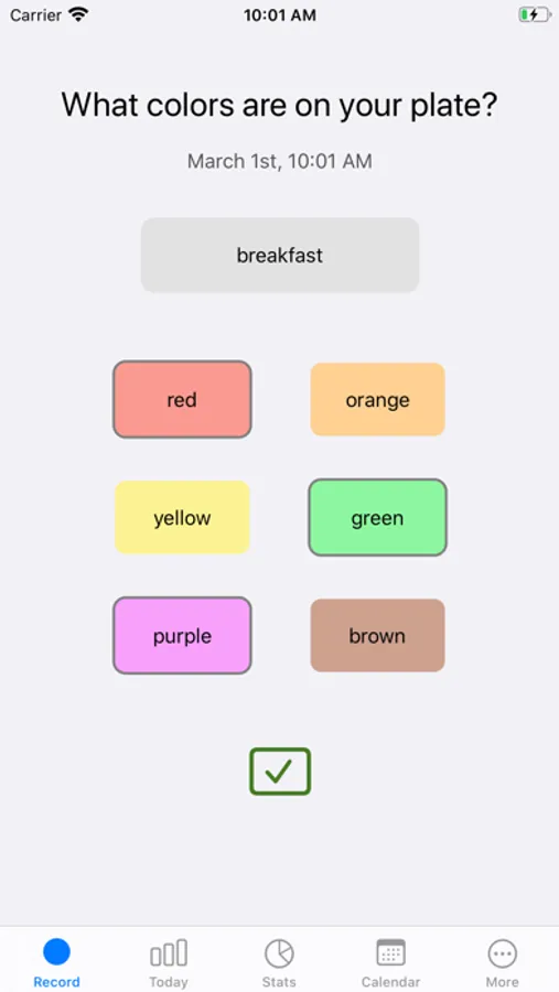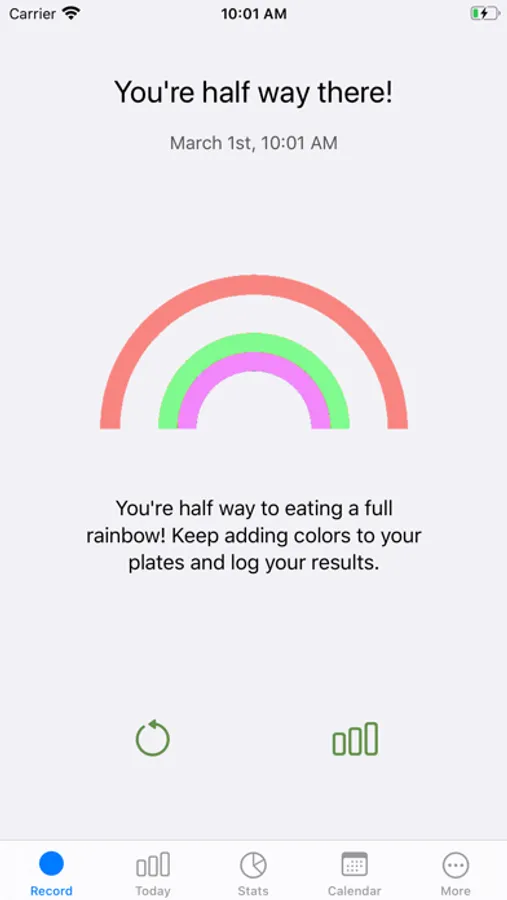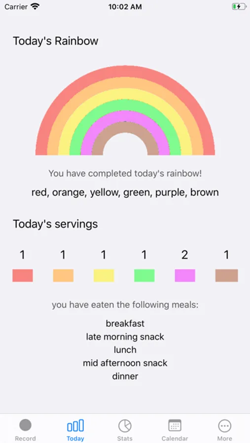 Today, Stats, and Calendar tabs provide your tallies as you continue to record your daily meals. Try to complete a rainbow each day!
