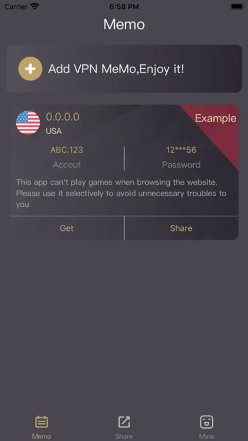 VPNMEMO app is a tool software to help you manage VPN account information and share VPN applications. Through our app, you can do the following: