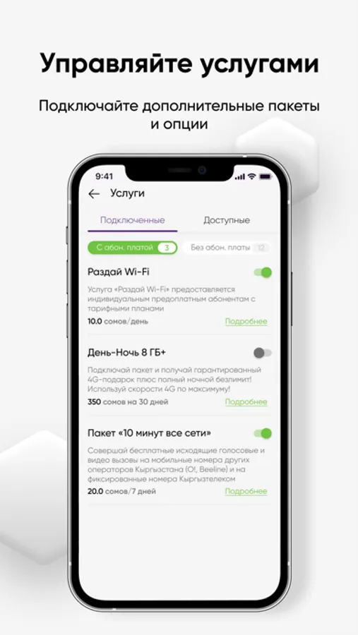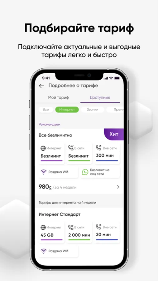 • Легко подбирать выгодные тарифы и подключать их в один клик.