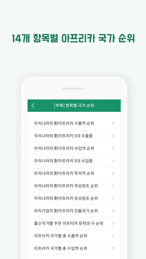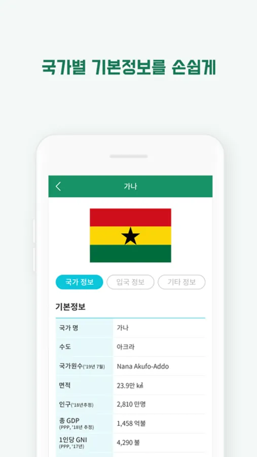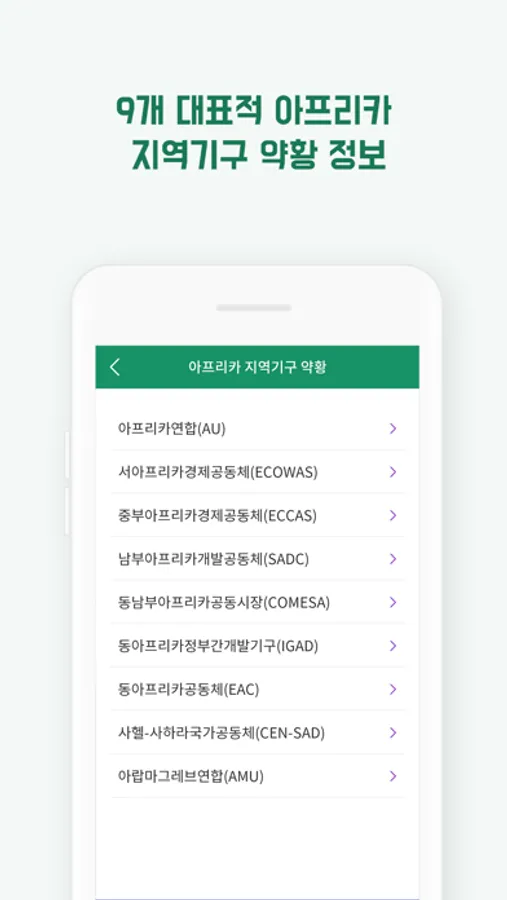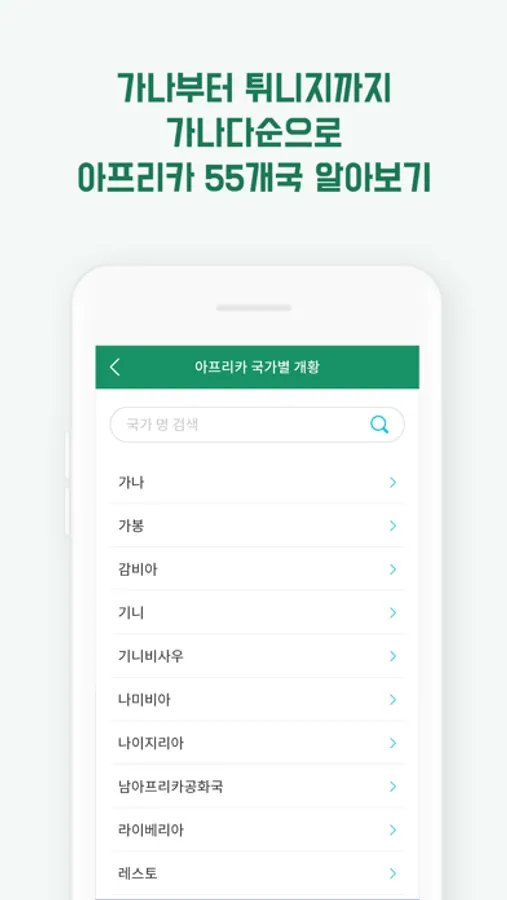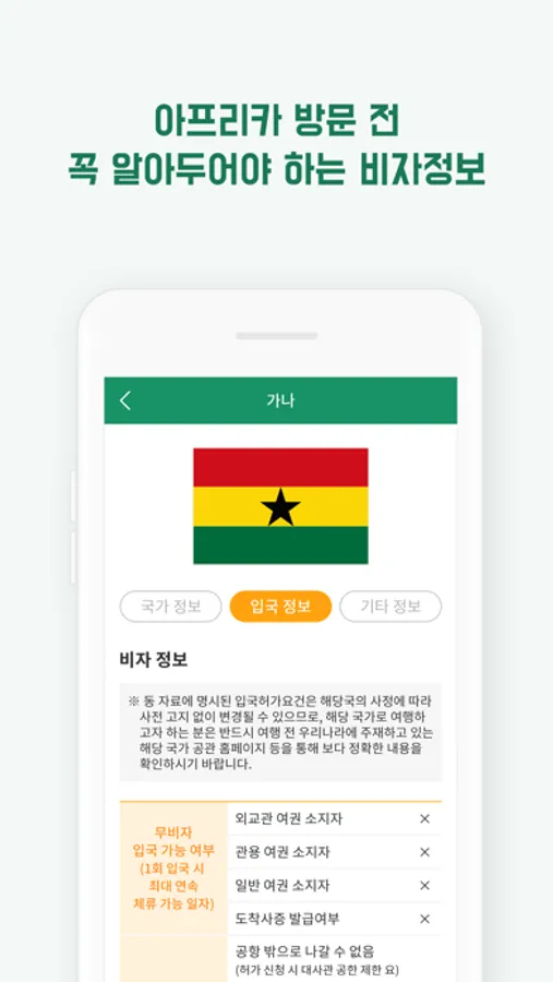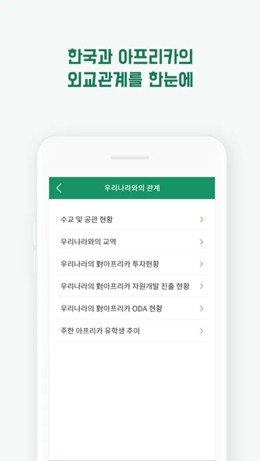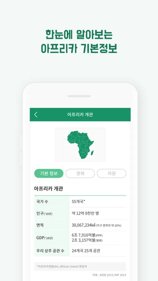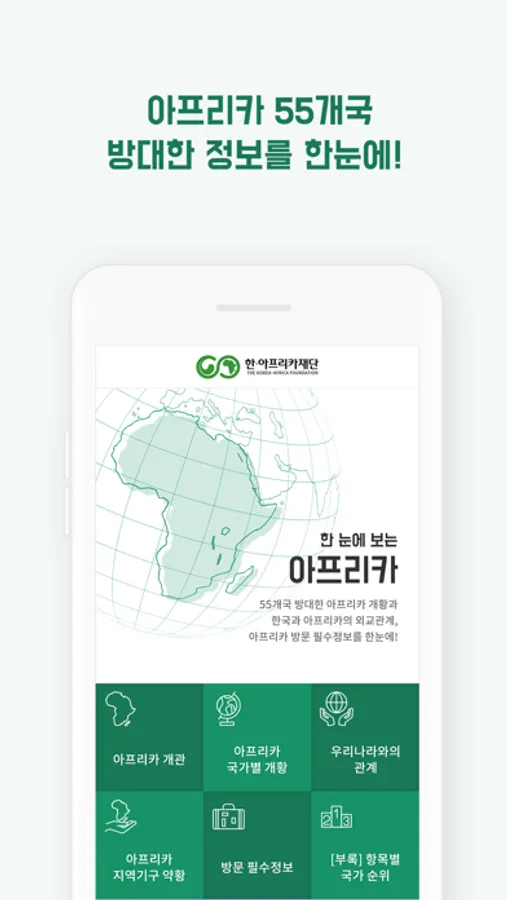 『한 눈에 보는 아프리카』 모바일 앱은 아프리카 개관 및 국가별 개황, 한국과 아프리카의 외교관계, 아프리카 지역기구, 방문 필수정보 등 아프리카 관련 핵심 정보를 제공합니다.