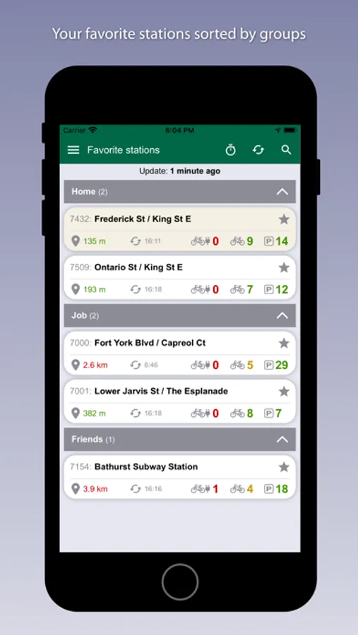 - List of favorite stations categorized by groups (home, work, friends or general).