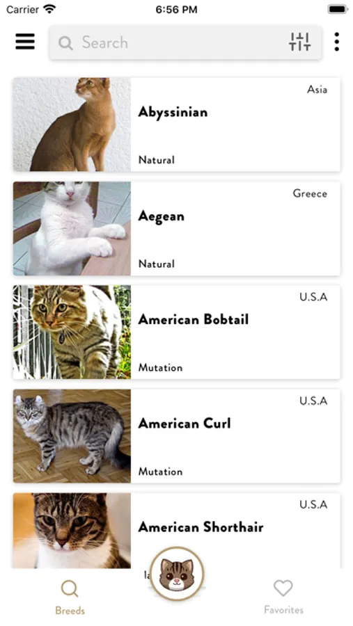 Searching: Maybe you want to search for a particular cat breed but you can’t seem to remember the name. This app lets you find all the Cat breeds using efficient sorting parameters such as origin, body type, coat length, federations & clubs, etc.