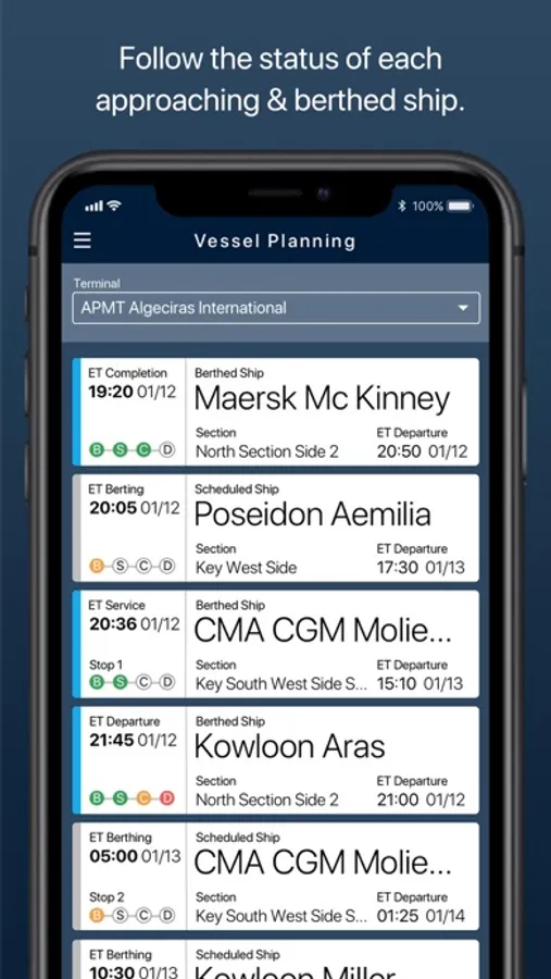 List view provides summary of planned vessel visits and currently berthed vessel visits sorted based on time.