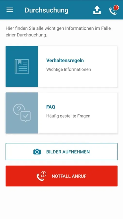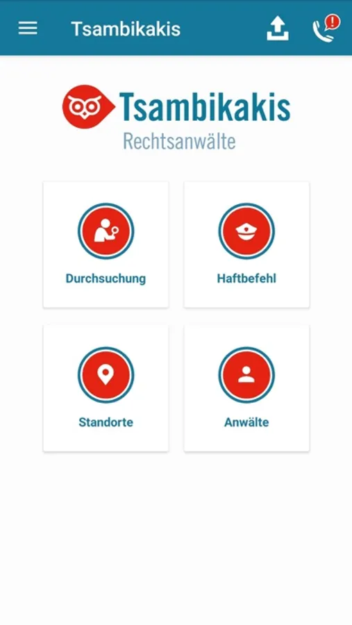 The Tsambikakis & Partner App offers you all-round support in the event of (impending) dawn raids or warrants. The app informs you comprehensively about the correct behavior and answers your most pressing questions. If an emergency occurs, you can always use the emergency functions of our app to obtain competent legal assistance. You can also easily contact one of the lawyers at our four locations via the app for a consultation.