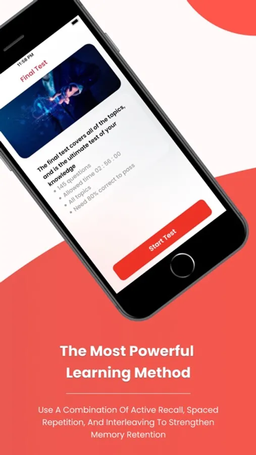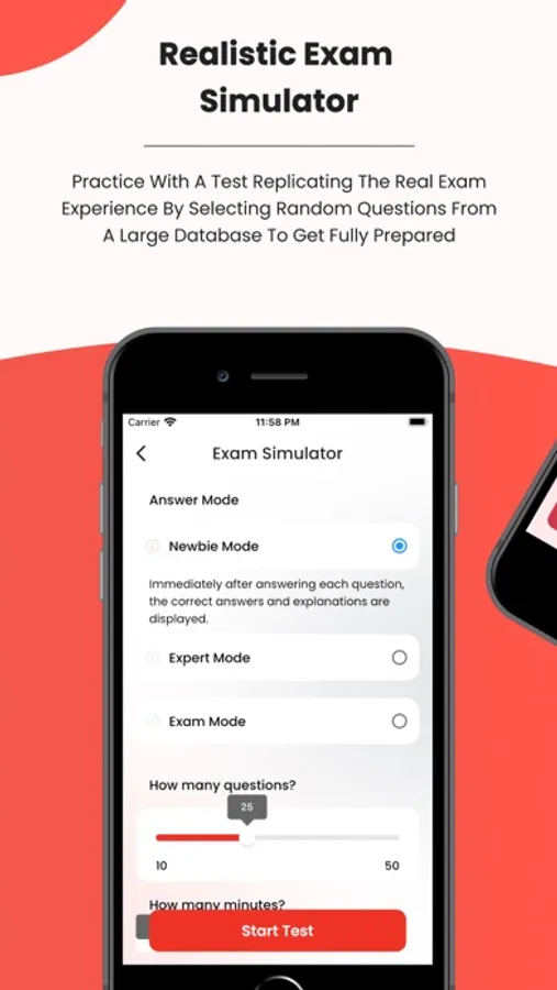 • Mock test: Mock test simulates the real test format. When you finish the test you will see your score and review all the questions.
