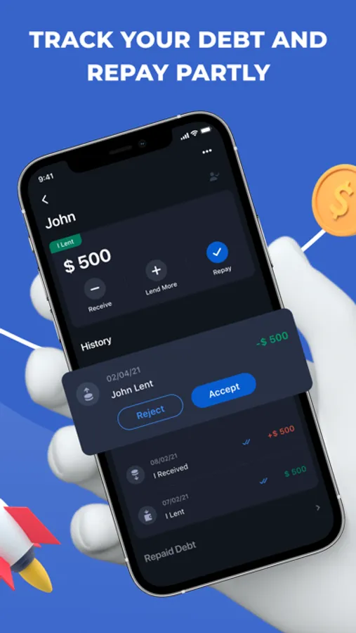 JOINT DEBT TRACKING. Collaborate with friends, family, and colleagues. Confirm transactions and ensure fairness and precision.