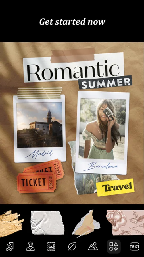 Beautiful backgrounds for creating a collage are already in the app. Choose a background, choose stickers, write text, and your collage is ready.