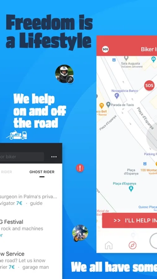 ○ S.O.S. BUTTON - every biker within 3 km with the app installed will automatically receive a message asking for help for a biker in emergency;