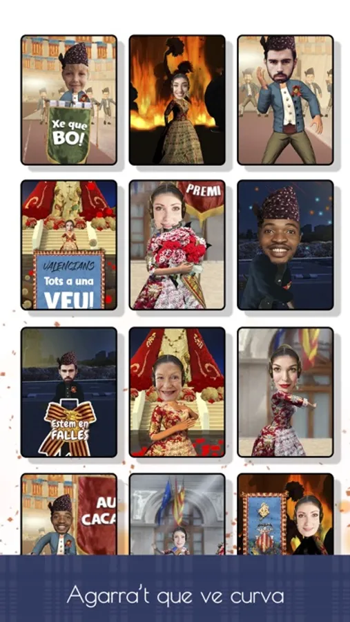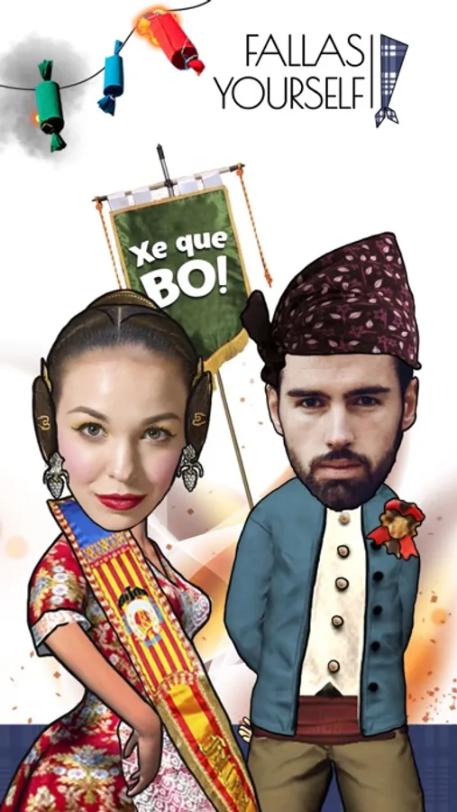 Download now and try the most hilarious gif animations with your face in Las Fallas! Select a funny scenario that suits you; use our face montage tool to put your face on a Fallera easily. Place your face in the gif animations and instantly create short video clips to share with your friends. Live the spirit of Las Fallas in Valencia with funny dances!