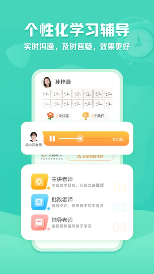 小鹿写字为7-12岁的孩子提供练字、编程、口才的素养学习内容。专业的教研团队结合海量学习数据支持,帮助孩子实现全方位的能力发展。