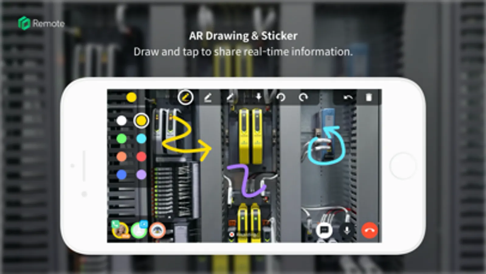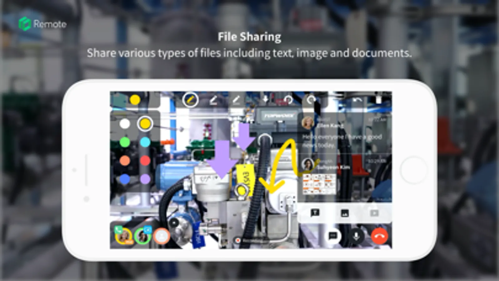 With AR technology, you can draw lines and add stickers on the screen to give a help more intuitively and practically. In addition, various ways of remote support are possible by sharing files such as text and images through a chat panel.