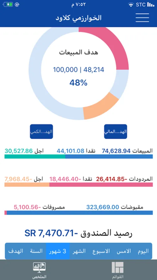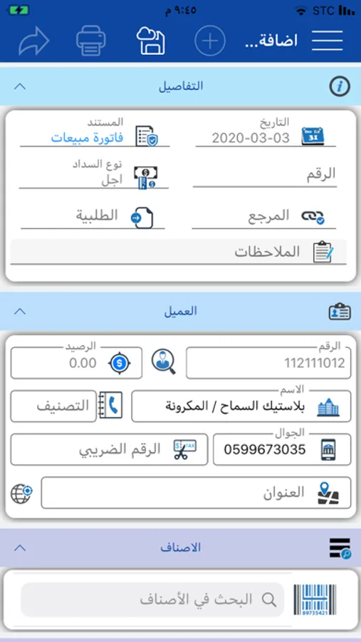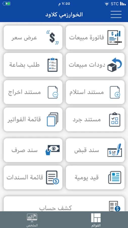 الخوارزمي كلاود للمبيعات والمحاسبة والمخازن من شركة سكاي سوفت للحلول المالية والإدارية ويحتوي على فواتير مبيعات وعروض اسعار وطلبات البضاعة واستلام وتسليم للمخزون وجرده واضافة العملاء والاصناف بالاضافة الى سندات القبض والصرف واليومية العامة وكشف الحسابات ويتضمن هذه الميزات: