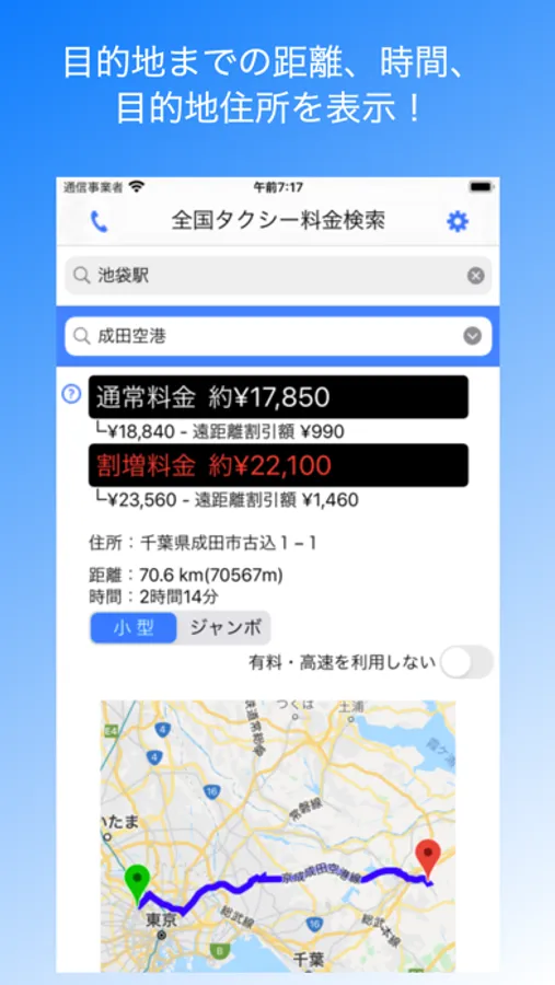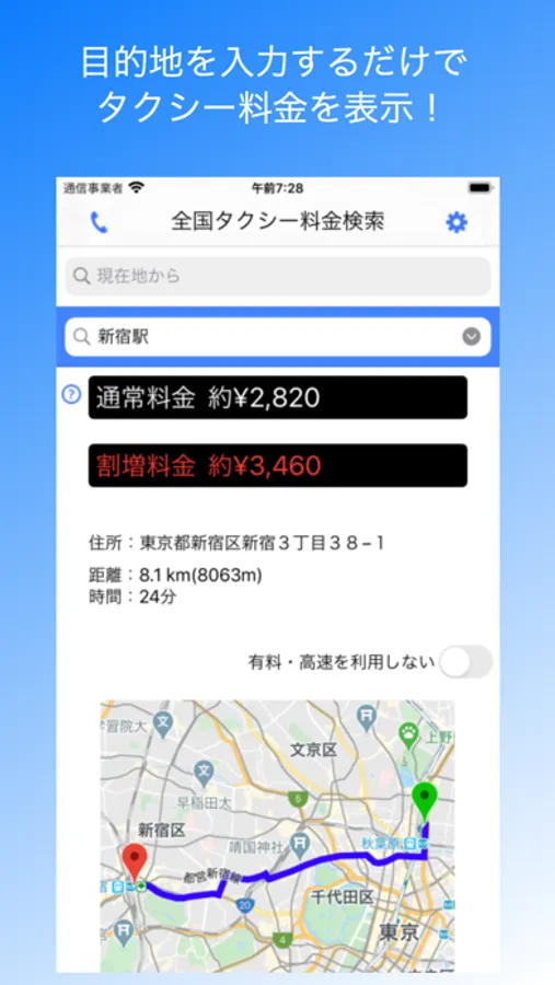割増料金(深夜)、有料・高速道路利用時のタクシー料金も検索可能です。