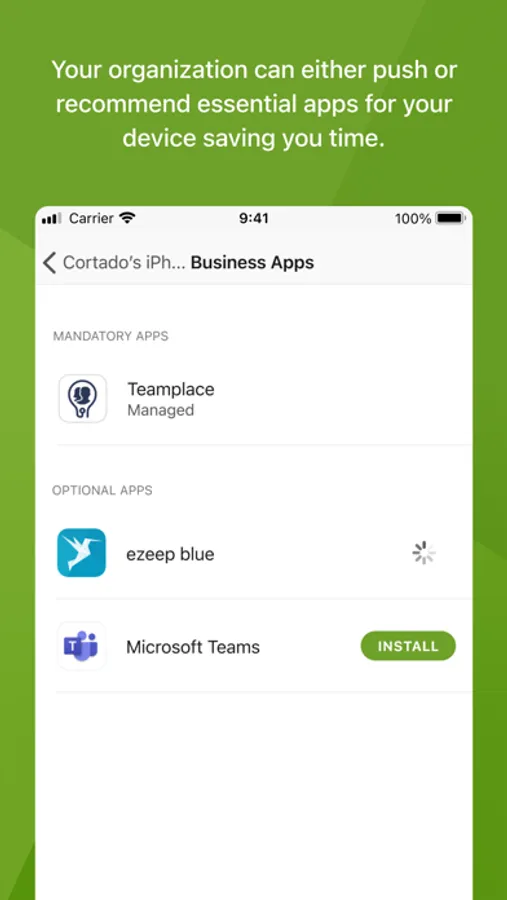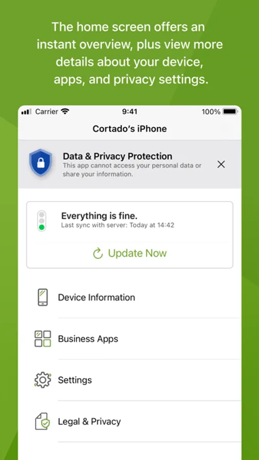 Once connected to Cortado's MDM system, an authorized administrator from your company can remotely manage and control business apps, data, security policies, and other relevant device and security settings on your iPhone or iPad.