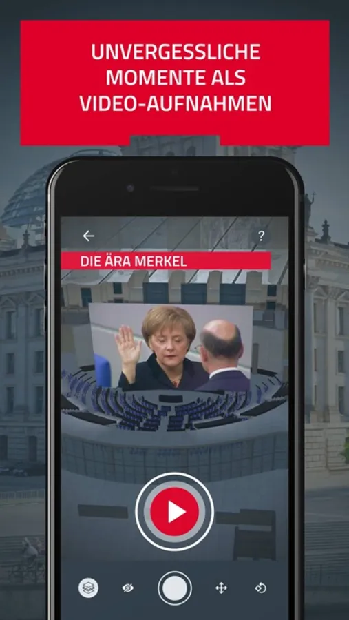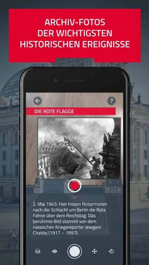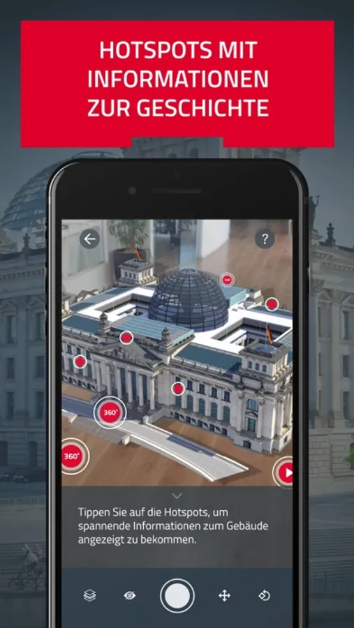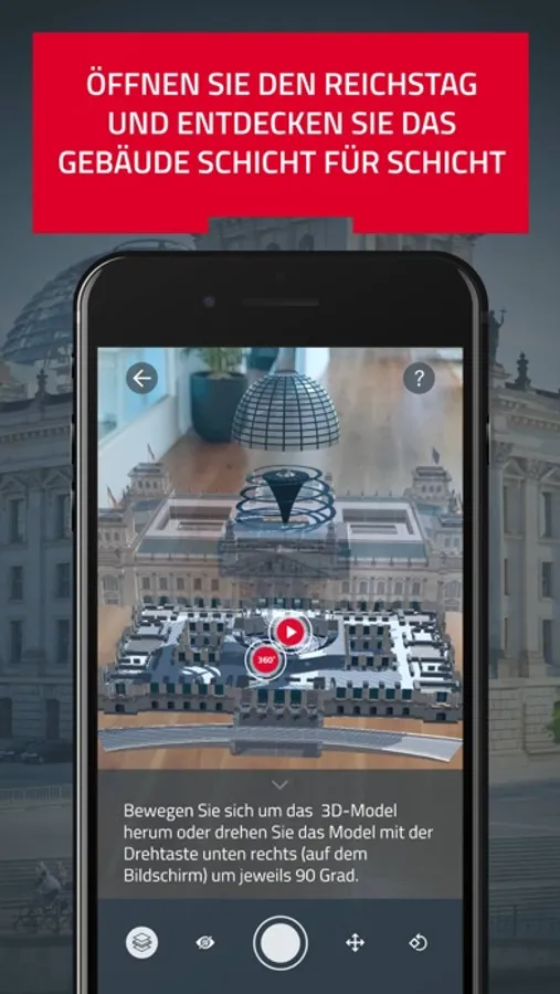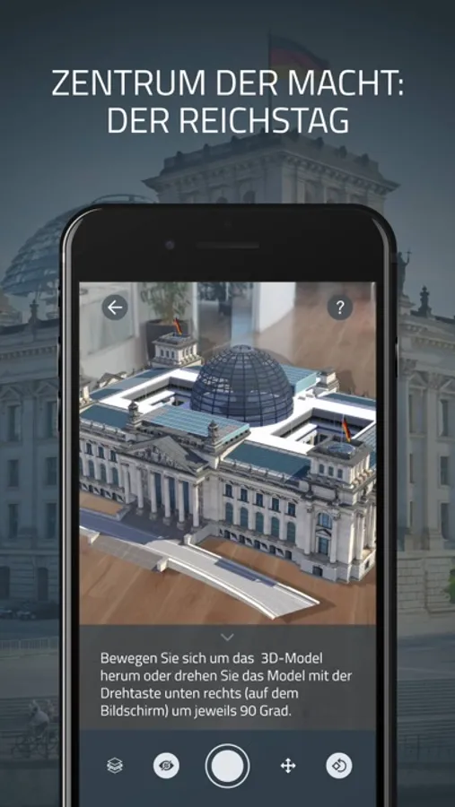 Mit der Augmented Reality Anwendung ntv "Der Reichstag" erleben Sie den Berliner Reichstag als interaktive AR-Experience. Innerhalb der Applikation kann ein 3D-Modell des Reichstags auf einer beliebigen Fläche platziert werden. Über Touchpoints werden anschließend spannende Video- und Audioelemente - darunter Archivmaterial - aufgerufen. Dank vor Ort aufgenommener 360-Grad-Bilder können Sie sich virtuell in den Reichstag hineinversetzen.
