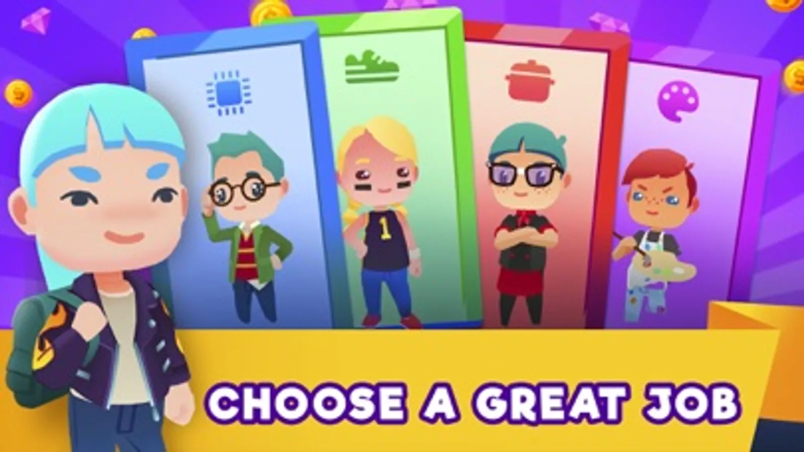 Be an artist, a sportsperson, a tech, a cook... There are many options to choose your new lifestyle! Start with a normal job and improve your professional skills to be a leading figure in your field. Accept job promotions and move up in your company. Work hard and get a pay raise. Earn prestige points to have better skills and a better wage. Accept other jobs to get extra money, and buy the house of your dreams or a classy suit for your new workplace.
