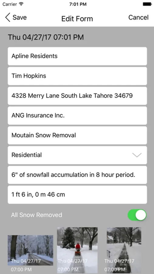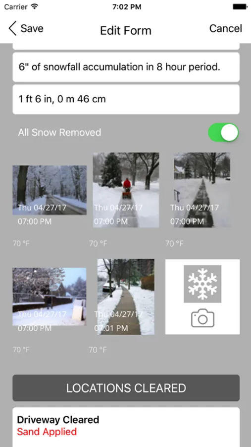Areas cleared of snow may be selected and auto-filled into the document. This document satisfies most insurance documentation. Images of driveways, sidewalks and parking lots can be captured and time-date stamped into the certification document.