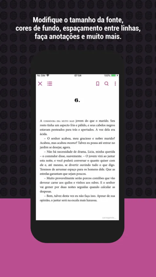 - SUA LEITURA, SUAS REGRAS! Personalize a sua experiência modificando tamanho da fonte, cores de fundo e espaçamento entre linhas.