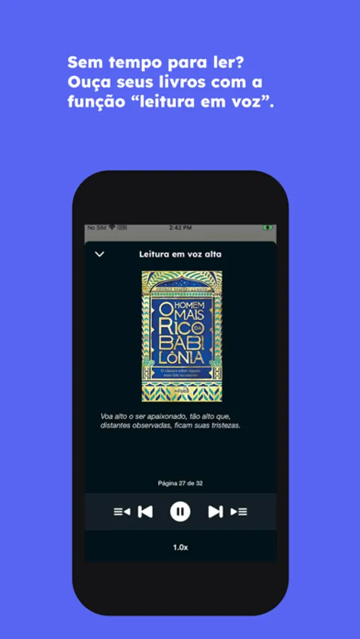 Ouça no seu ritmo: Com a função de leitura em voz alta você aproveita os livros do seu jeito. Aumente a velocidade de reprodução em até 2 vezes. Esta função fica ativa em segundo plano, ou seja, você pode continuar usando o celular enquanto ouve o livro.