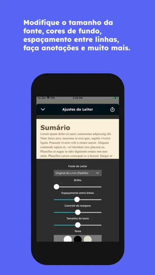 Sua leitura, Suas regras! Personalize a sua experiência com o tamanho da fonte, cores de fundo e espaçamento entre linhas, e faça anotações e marcações em seus livros para revisar posteriormente.