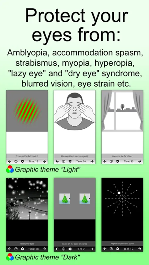 • A widest range of visual exercises: to improve blood circulation, to relax ocular muscles, to relieve fatigue and tension, and enjoyable relaxation exercises!