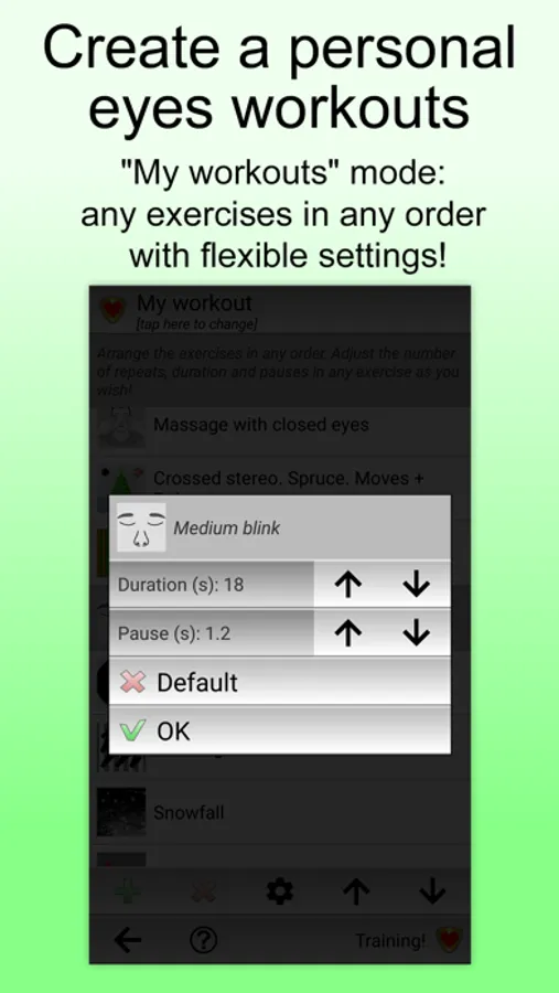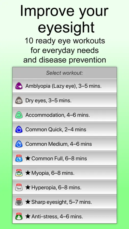 If your oculist has advised you on certain vision exercises, you can use the "My workouts" mode to create your personal vision training or selectively run the eye exercises you need from the List of exercises.