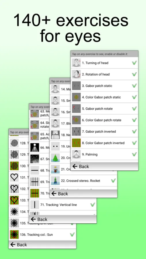 • Access to 140+ exercises for eyesight with the ability to disable any exercise that doesn't suit you. All ocular exercises are animated and there are additional hints: graphics, voice, text and video.
