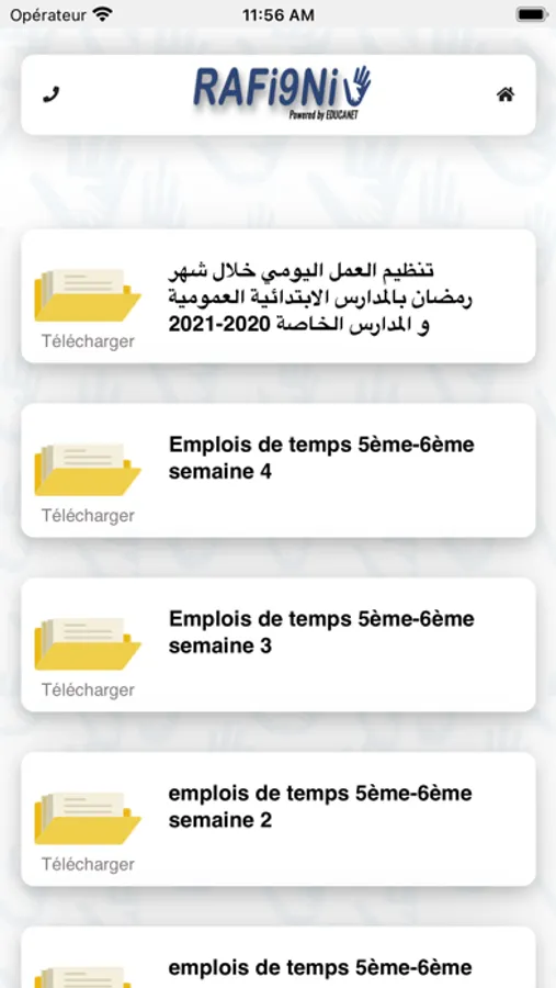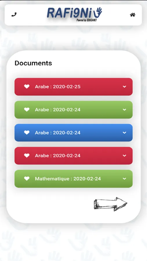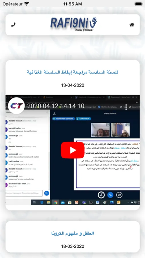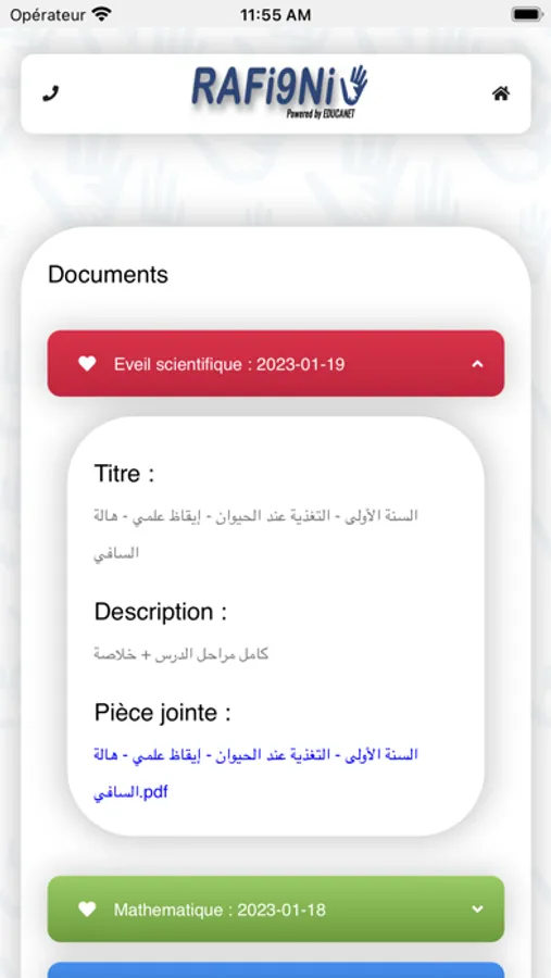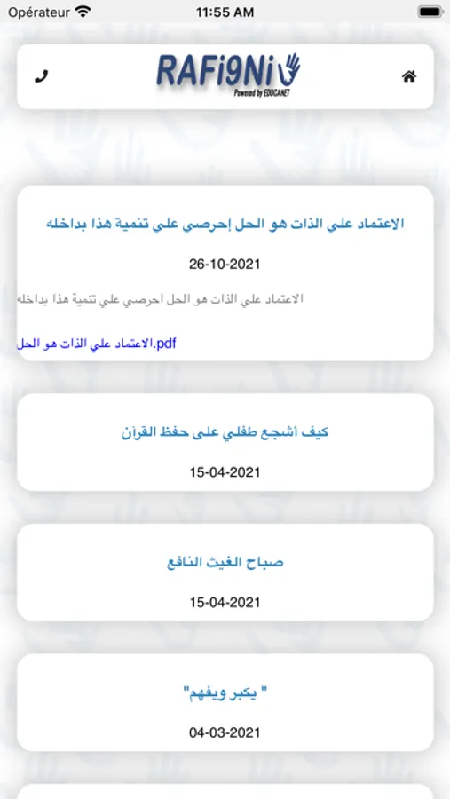 رافقني: تطبيقة مرافقة للولي في المجال البيداغوجي و النفسي و الغذائي و الرياضي و الثقافي. كل أسبوع يتلقى الولي على حسابه وثائق تعليمية مع الإصلاح، ملخصات، قصص، ألعاب، نصائح ما قبل أثناء و بعد الإمتحانات، الوجبات الصحية ..... مع رافقني لا حاجة للبحث في المواقع و على الفايسبوك.... مختصون يعينونك على مرافقة أطفالك...