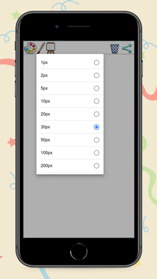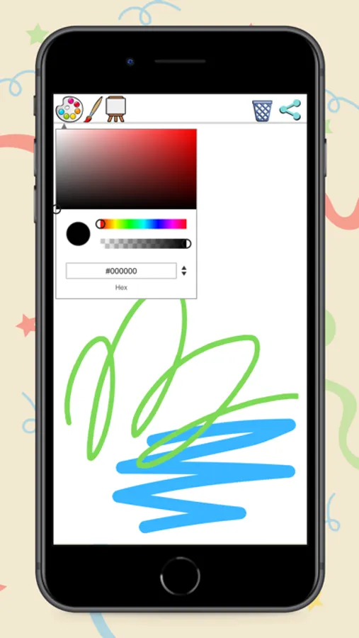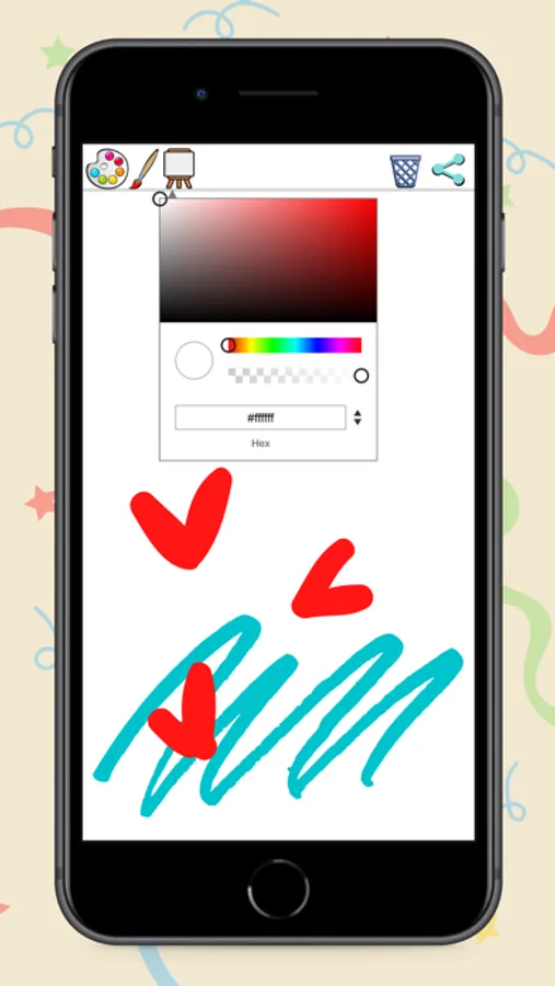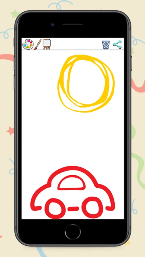 You can choose different colors by touching the feathers or brushes at the top of the screen to paint, also includes to erase and trash to throw away the entire drawing and start drawing again.