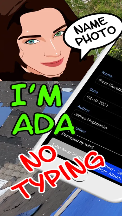 ADA will ask the user to answer various questions: Name/Title of photo and Description while globally setting Author and Date taken. The user can speak the answers to the question for Ada's voice to text impute or just type the data in the space provided. The app is built to be "user friendly" by allowing the user to determine the speed of automation in the app along with many efficiency bells and whistles. ADA Business Photo App easily stops and starts based upon user's work process and picks up again where the user left off for ease of completion on every project/job.
