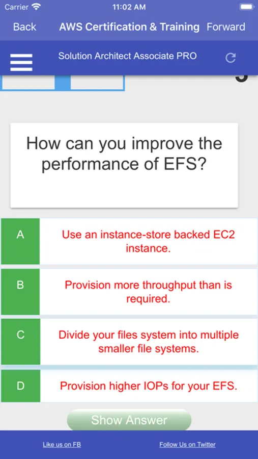 Note and disclaimer: We are not affiliated with AWS or Amazon. The questions are put together based on the certification study guide and materials available online. We also receive questions and answers from anonymous users and we vet to make sure they are legitimate. The questions in this app should help you pass the exam but it is not guaranteed. We are not responsible for any exam you did not pass.