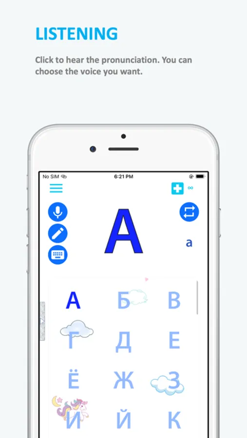 · When you press a word, letter, or number, the pronunciation of the selected learning language is heard.
